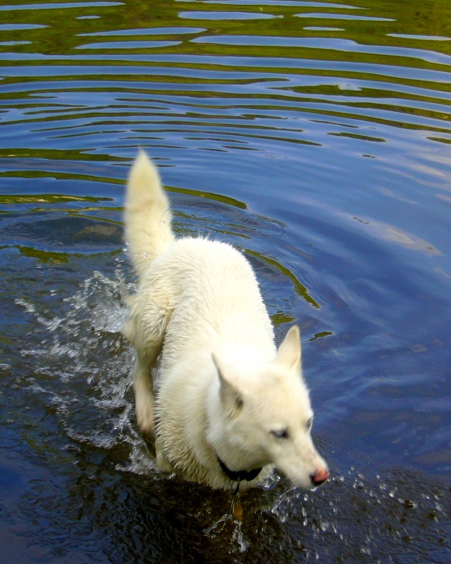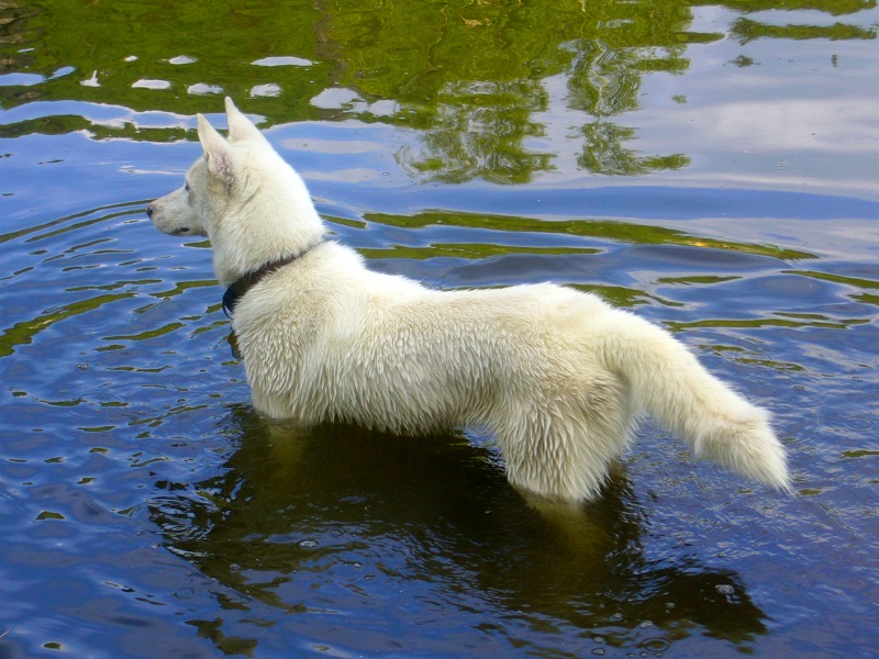 Ač Bella ráda a ochotně aportuje téměř jakýkoliv předmět (míček, klacek, …), tak na hozený klacek do rybníku nereagovala. Opatrně našlapovala a nechápala, že se ji boří nohy do něčeho mokrého a studeného. Kamarádův pes (zkušenější plavec) se pro klacek vrhl a zdatně pro něj plaval. Na druhé vhození se pro něj už vrhly spolu. Při třetím aportu, kdy Bella byla pomalejší v plavbě za klackem, si na hladině všimla několika kachen a lovecký pud (nebo spíš zvědavost - „jak to dělají, že si na té vodě sedí“) zavelel změnit kurz.